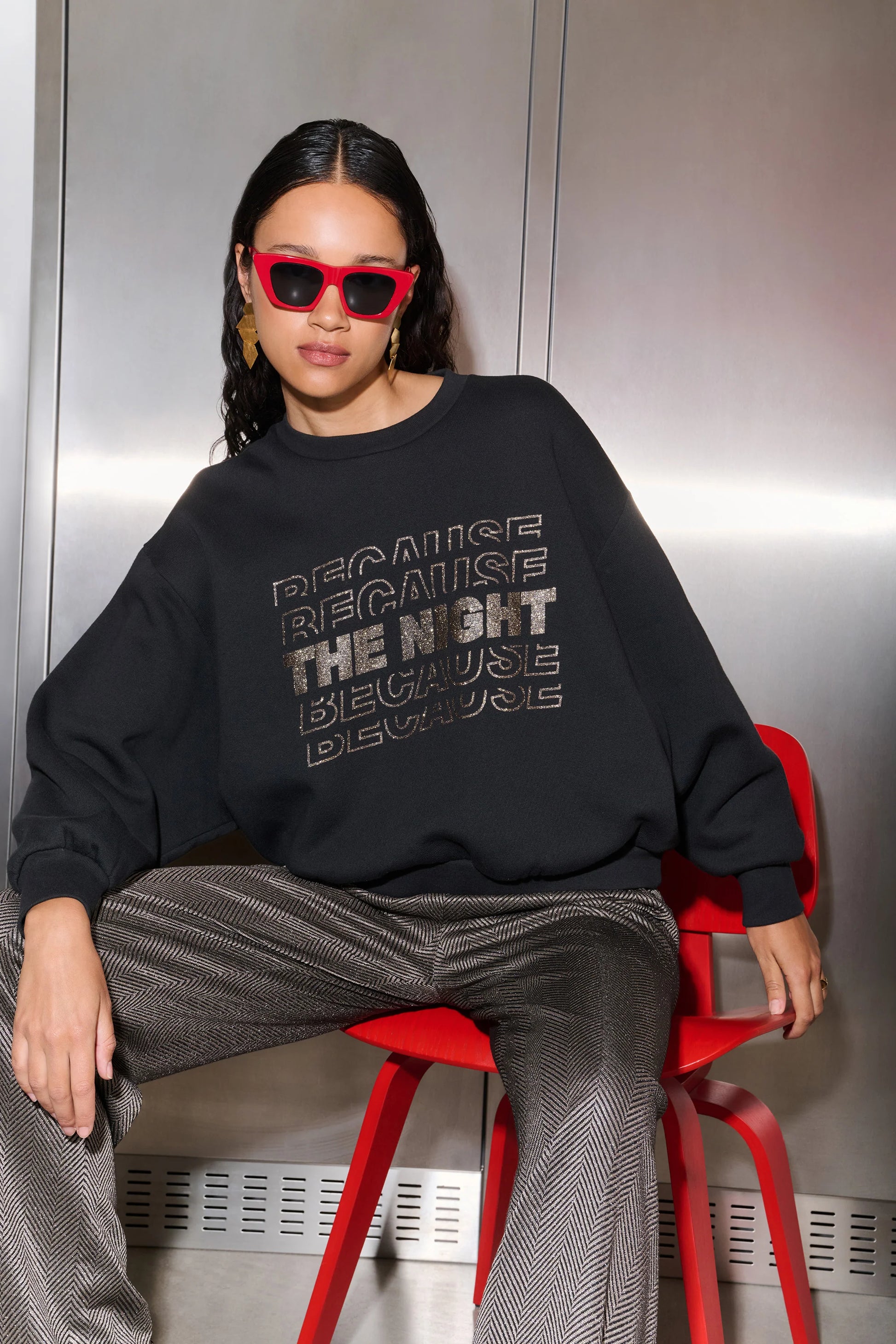 Le sweat "Because the night" va devenir ton nouveau sweat décontracté préféré avec une coupe oversize confortable et une qualité coton toute douce. Les coutures d’épaules tombantes offrent un look relax, tandis que l’imprimé brillant apporte une touche unique à ta tenue. Parfait pour tous les jours, avec des manches longues et un col rond classique qui allient style et confort.